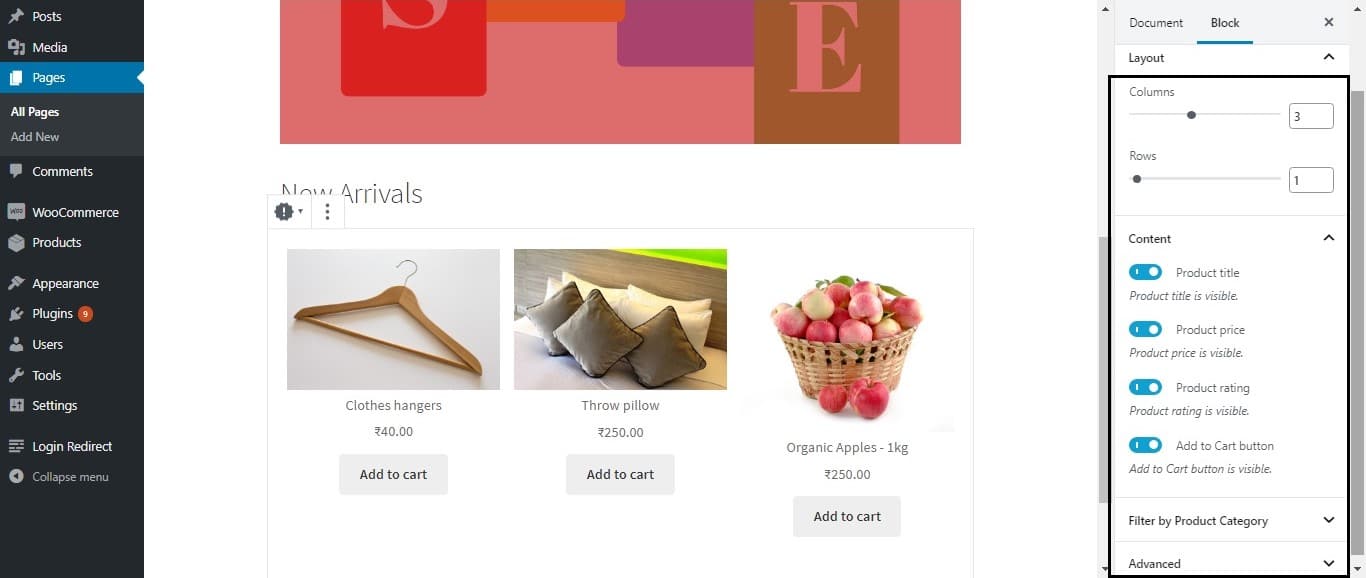 You can see that the Newest Products block pulls in the most recently added products from your WooCommerce store. You can choose to display as many products as you like for this block by setting the number of rows and columns to display, as well as filter the products by category using the options on the right sidebar: