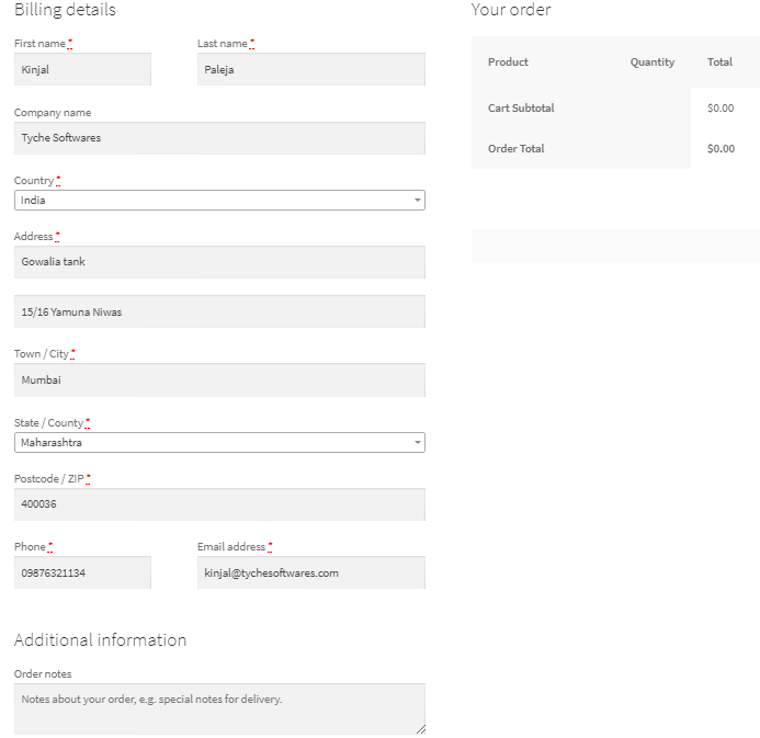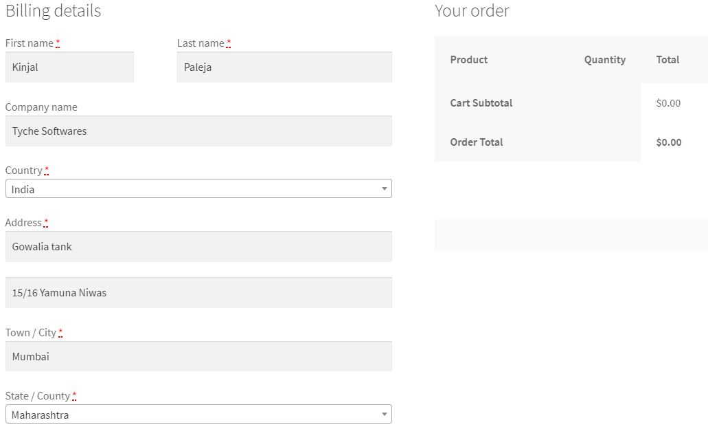 The above image shows a single page checkout process where the selected products are listed in the template format which we had opted for. The Billing details and Your order sections are shown below the products on the same page.