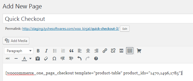 After you have selected the products to be added and the template in which these should be displayed, click on the Create Shortcode button. This will add a shortcode to the created page as shown below. Thus Quick Checkout is the new page created now.