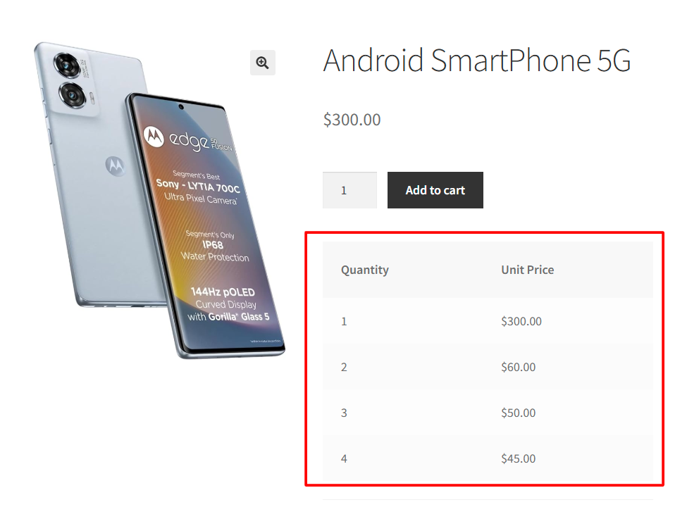 When customers visit the product page, a bulk pricing table appears below the Add to Cart button, showing different quantity tiers and their corresponding unit prices.