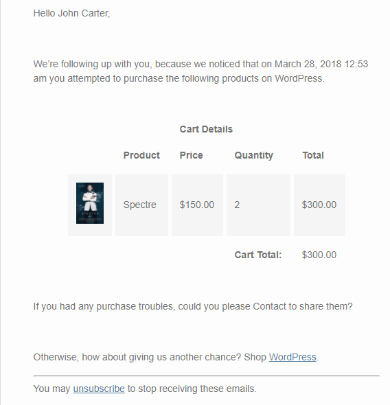 A customer named John Carter purchased product Spectre worth $150 with a total cart amount of $300 as he took 2 of these, but never purchased the items. Hence the cart got abandoned on March 28th 2018 at 12.53 am. Now this cart got saved as an abandoned cart and hence the recovery mechanism is applied on it.